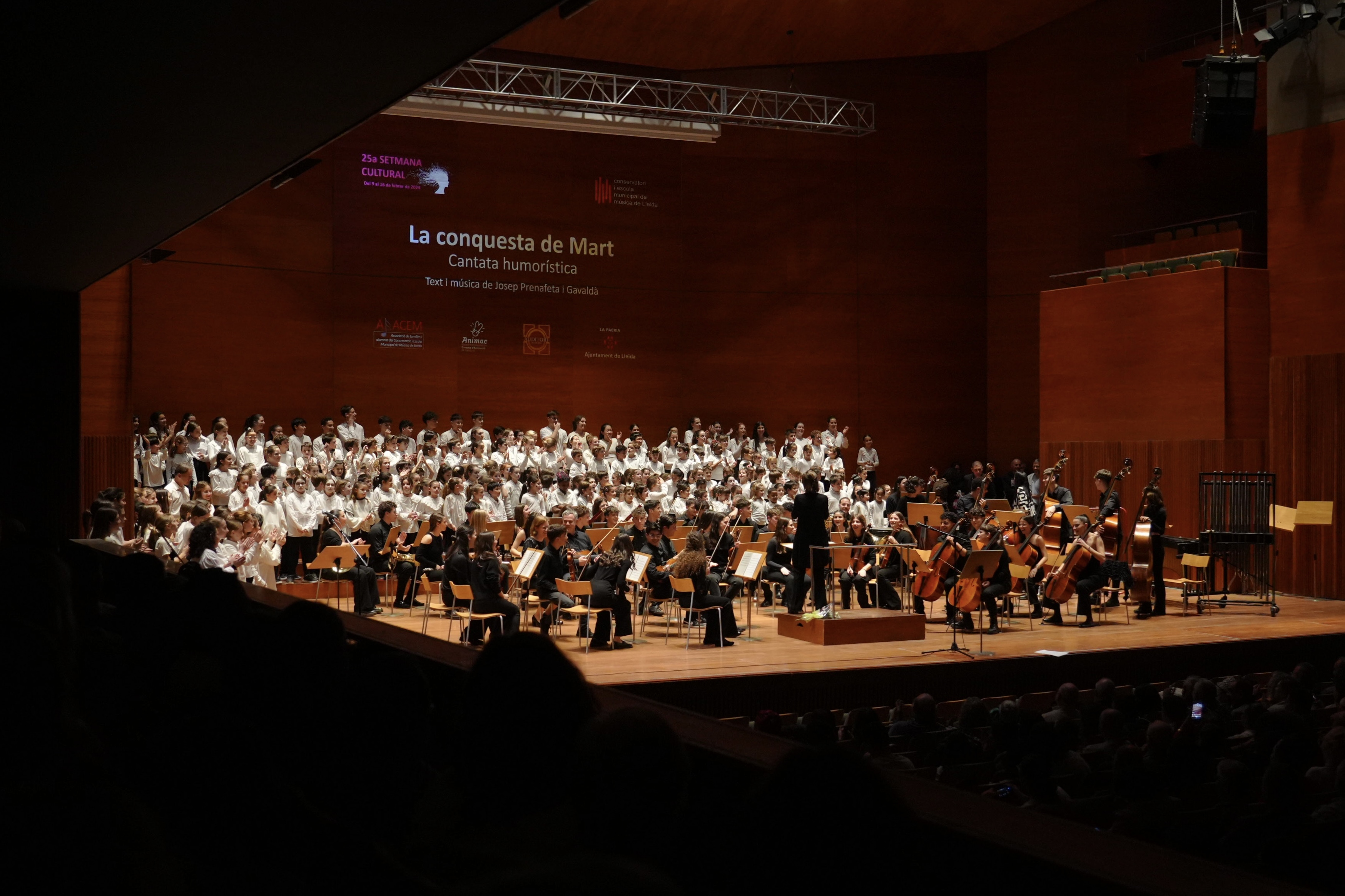 El concierto con el alumnado del Conservatorio y Escuela Municipal de Música de Lleida (CiEMML) ha cerrado el programa de actividades de la Semana Cultural del centro, una semana que este año ha llegado a la 25 edición. Unos 300 alumnos, de entre 6 y 18 años, han subido al escenario del Auditorio municipal Enric Granados para interpretar la Cantata "La Conquista de Marte", de Josep Prenafeta, quien fue profesor y director del Conservatorio. Así, el concierto ha corrido a cargo de los Coros y la Orquesta Sinfónica del CiEMML, dirigidos por Dolors Ricart. La parte escénica de la obra corre a cargo de la compañía teatral “La Máxima” de la Fundación Ilersis. Además, se ha realizado una proyección en directo en las redes sociales del Conservatorio.