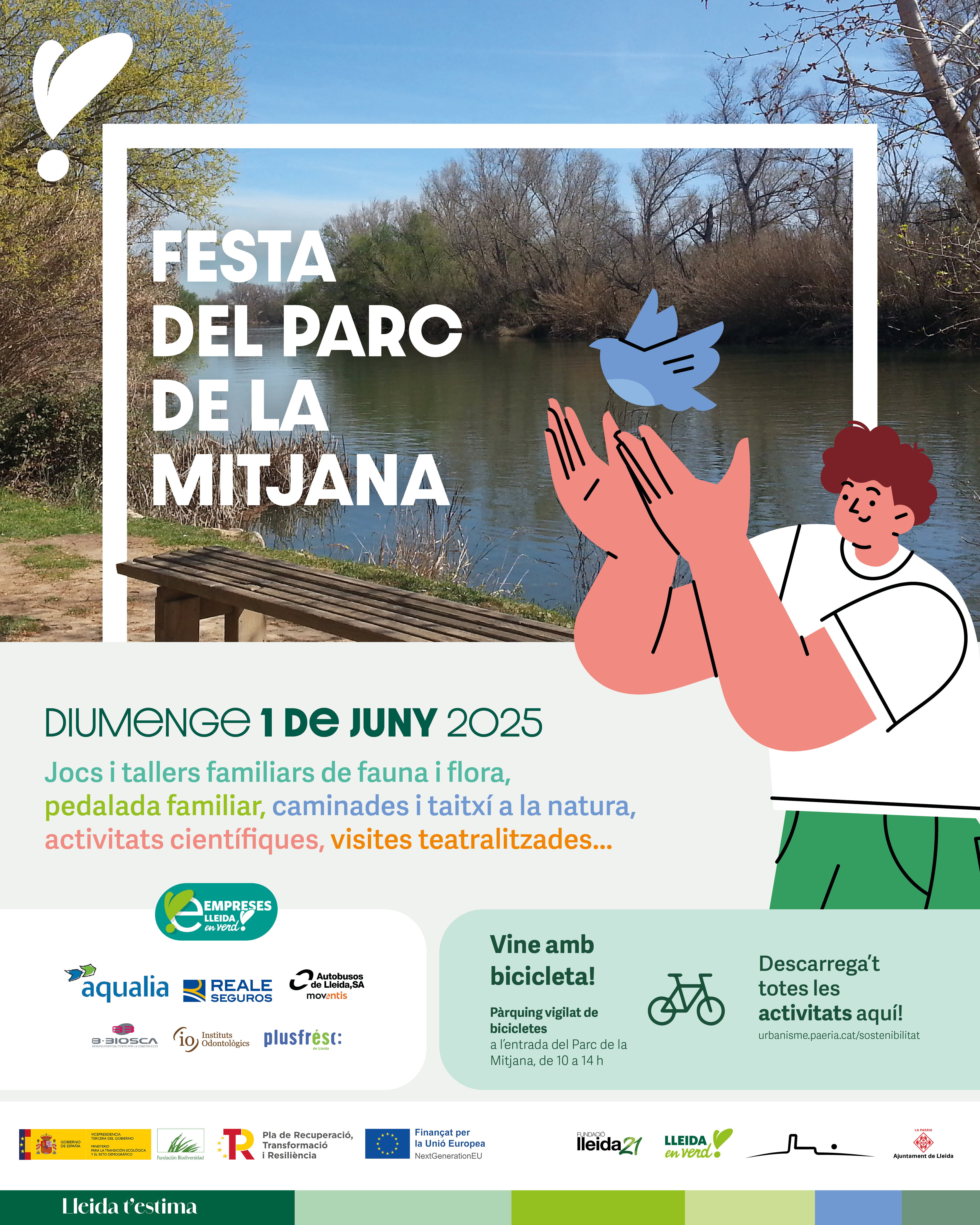El objetivo de la Fiesta de la Mitjana es poner el foco en la importancia de preservar la biodiversidad en nuestro entorno. A su vez, quiere poner en valor otros factores beneficiosos que tiene la biodiversidad en la ciudadanía como la socialización, la actividad física y el bienestar. La Fiesta de la Mitjana se enmarca en el proyecto URBAN-NAT Lleida, de renaturalización, adaptación al cambio climático y mejora de la biodiversidad de la zona urbana y periurbana de Lleida, que cuenta con el apoyo de la Fundación Biodiversidad del Ministerio para la Transición Ecológica y el Reto Demográfico (MITECO) en el marco del Plan de Reforma por la Unión Europea-Next GenerationEU.
