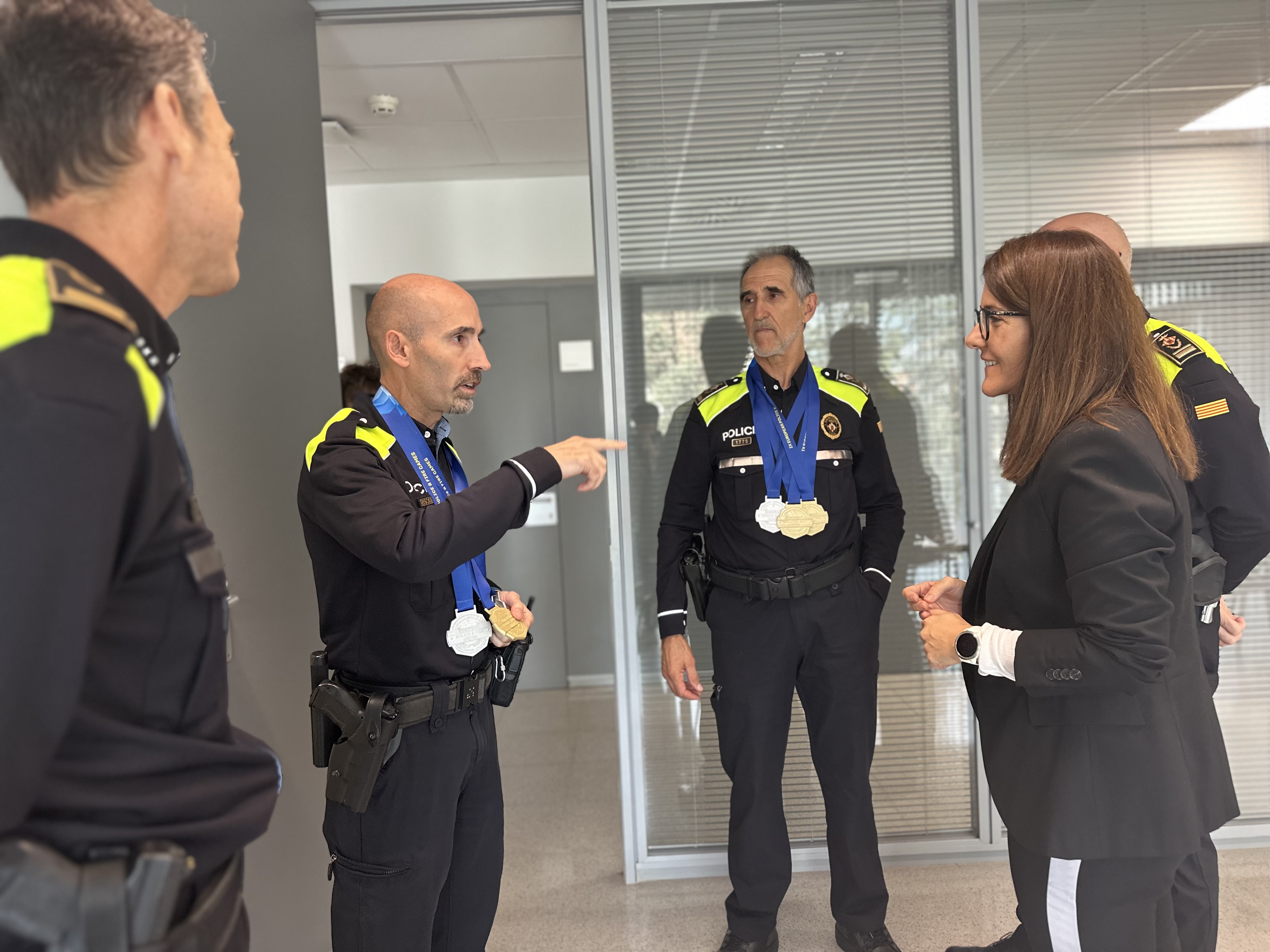 La Guardia Urbana de Lleida ha logrado un total de 6 medallas en los IX Juegos Europeos de Policías y Bomberos que se han celebrado en Torrevieja (Alicante) del 29 de septiembre al 7 de octubre. La 3ª teniente de alcalde y concejala Seguridad, Movilidad y Civismo, Cristina Morón, acompañada del Intendente Jefe, Josep Ramon Ibarz, y del inspector, Josep Ramon Mallada, ha hecho un reconocimiento a los dos miembros de la policía municipal , un inspector y un agente, después de su participación en este evento deportivo.