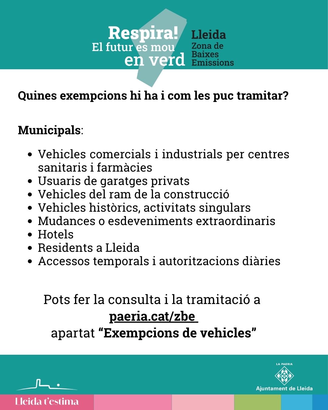 La consulta y la tramitación de las exenciones, así como si el vehículo no tiene distintivo ambiental y no se tiene domiciliado el vehículo en Lleida, puede realizarse a través de paeria.cat/zbe apartado “Exenciones de vehículos” .