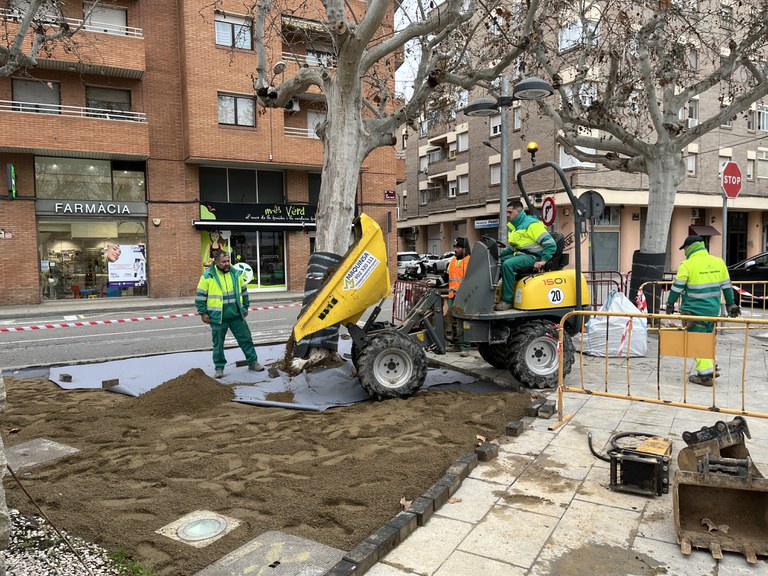 El Ayuntamiento de Lleida está actuando en la plaza Sant Jordi de la Bordeta, en el marco de la iniciativa de creación de senderos urbanos arbolados, que tienen como objetivo promover la continuidad de los recorridos con sombra peatonal, para mitigar el calor en verano.