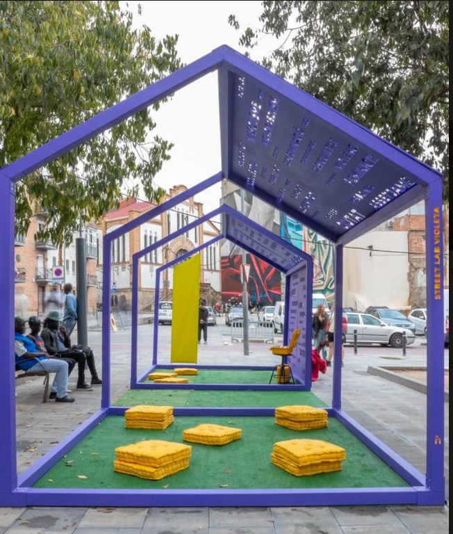-Street Lab Violeta: es una estructura lila de madera en forma de casita y con el tejado perforado con conceptos clave (sororidad, conciliación, etc.), tiene el objetivo de trabajar la percepción de los espacios privados y públicos desde una perspectiva de género.