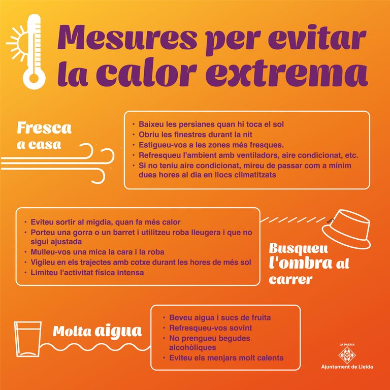 El Ayuntamiento de Lleida continuará este jueves con el Plan de actuaciones para prevenir los efectos de una ola de calor sobre la salud de las personas (POCSMLL) activado. Según el aviso recibido del Centro de Coordinación Operativa de Cataluña (CECAT), en la comarca del Segrià, hoy existe una probabilidad del 30 al 70 % de superar la temperatura de 41,7 ºC, de las 14 a las 20 h., alcanzando el umbral alto de peligro de calor intenso (5/6). Para mañana, la probabilidad es de menos del 30%, con un umbral de calor intenso de 4 en una escala de 6. Es decir, ante la previsión meteorológica de riesgo de calor que afectará a la ciudad, se activará el Plan en fase 2.