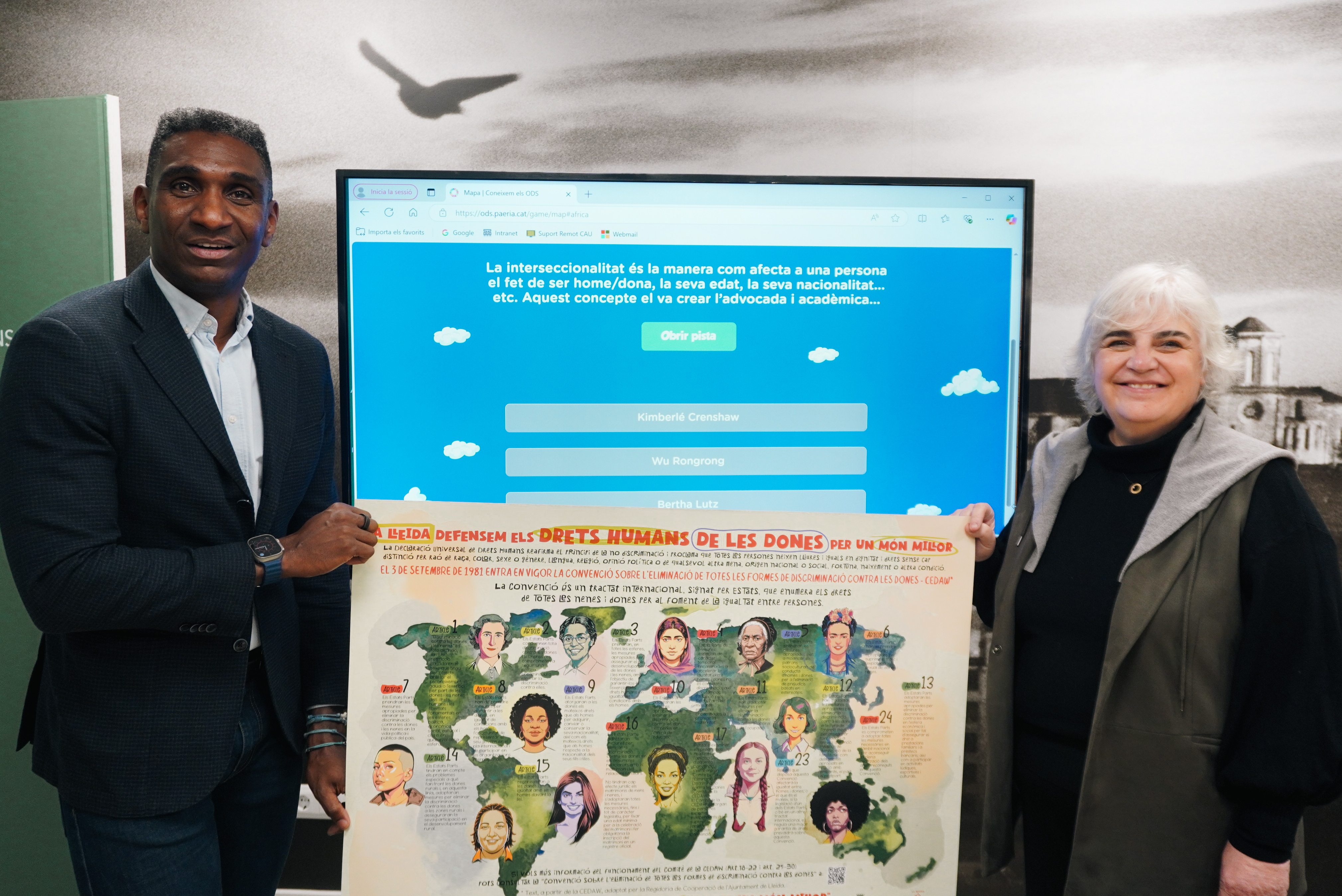 La teniente de alcalde y concejala de Políticas Feministas, Carme Valls, y el concejal de Cooperación, Jackson Quiñónez, han presentado esta doble propuesta, mapa mural y juego virtual, que se enmarca en los actos del 8M en Lleida, Día Internacional de las Mujeres, y que atiende a una de las prioridades, tanto desde el área de Políticas Desarrollo (ODS), especialmente el 5 sobre la igualdad de género.