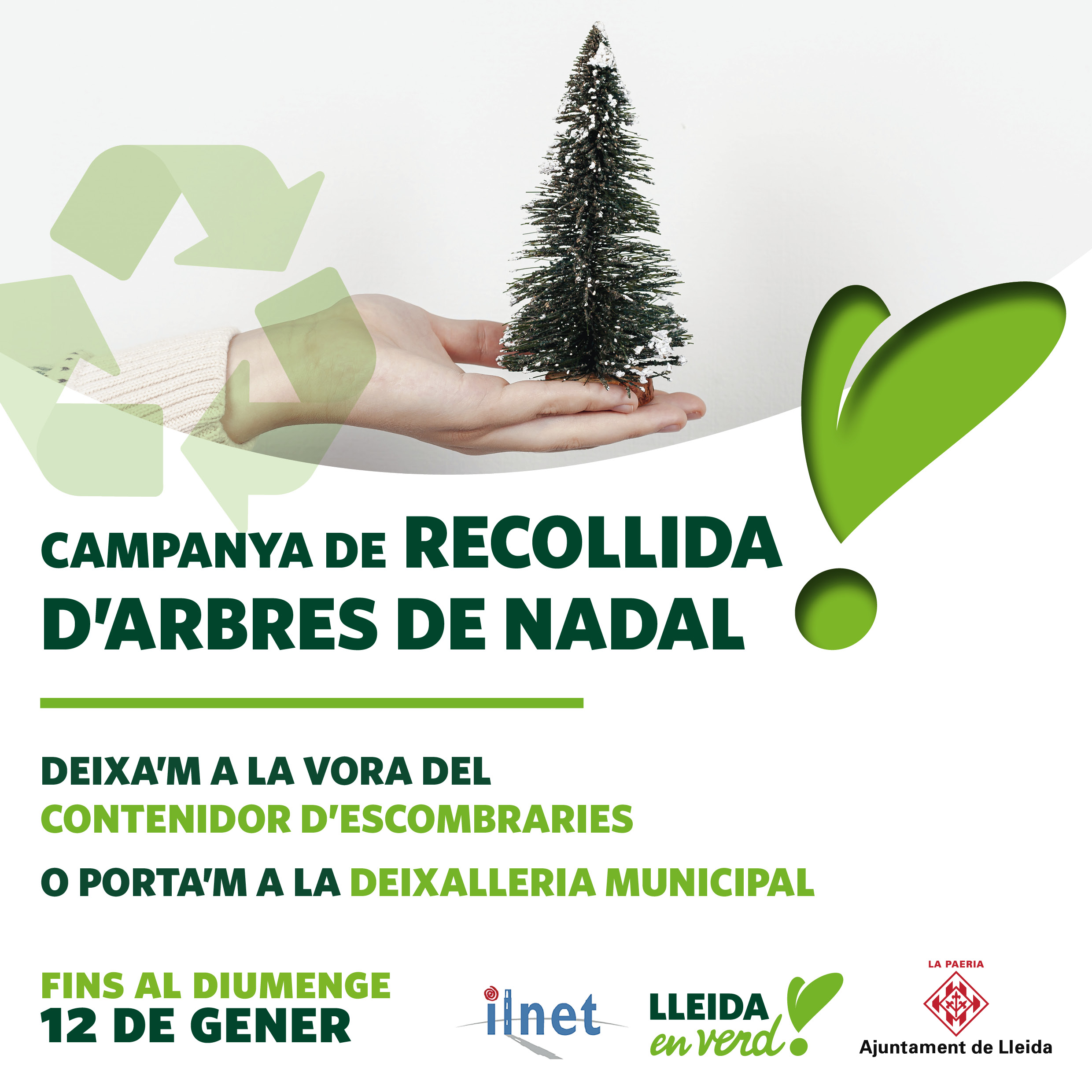 El Ayuntamiento de Lleida arranca este domingo 5 de enero el servicio de recogida de árboles de Navidad. La campaña estará activa hasta el domingo 12. Así, se podrán dejar los árboles al borde de los contenedores o bien llevarlos a los puntos limpios municipales. Por otro lado, el servicio también se ha habilitado en los barrios donde se encuentra el puerta a puerta (Ciutat Jardí, Vila Montcada y Camp d'Esports). En éstos, el vecindario deberá dejar los árboles junto a los contenedores de vidrio.