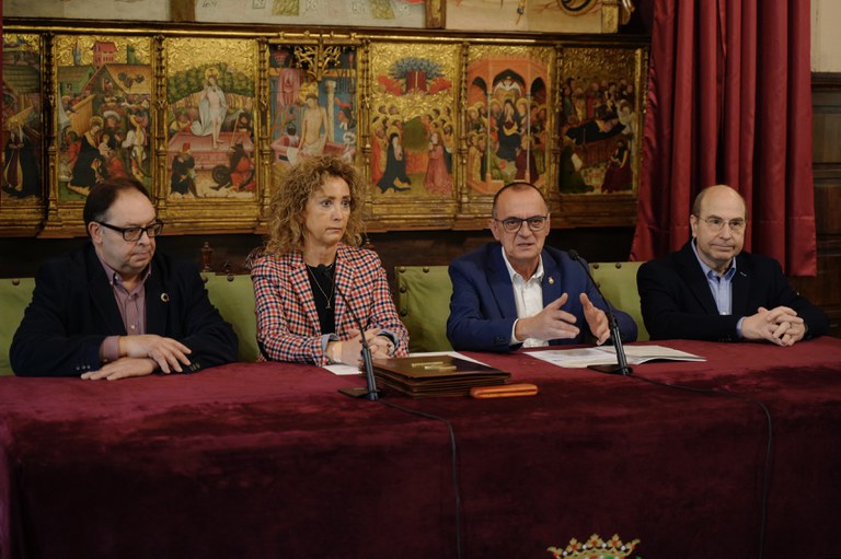 El alcalde de Lleida, Miquel Pueyo, acompañado de la concejala de Consumo, Comercio, Mercados y Participación, Marta Gispert, y los responsables de Fecom, Rafel Oncins, y Pimec Comerç, Manel Llaràs, han firmado hoy los convenios de colaboración de cara a nuevos proyectos y acciones para el 2023.