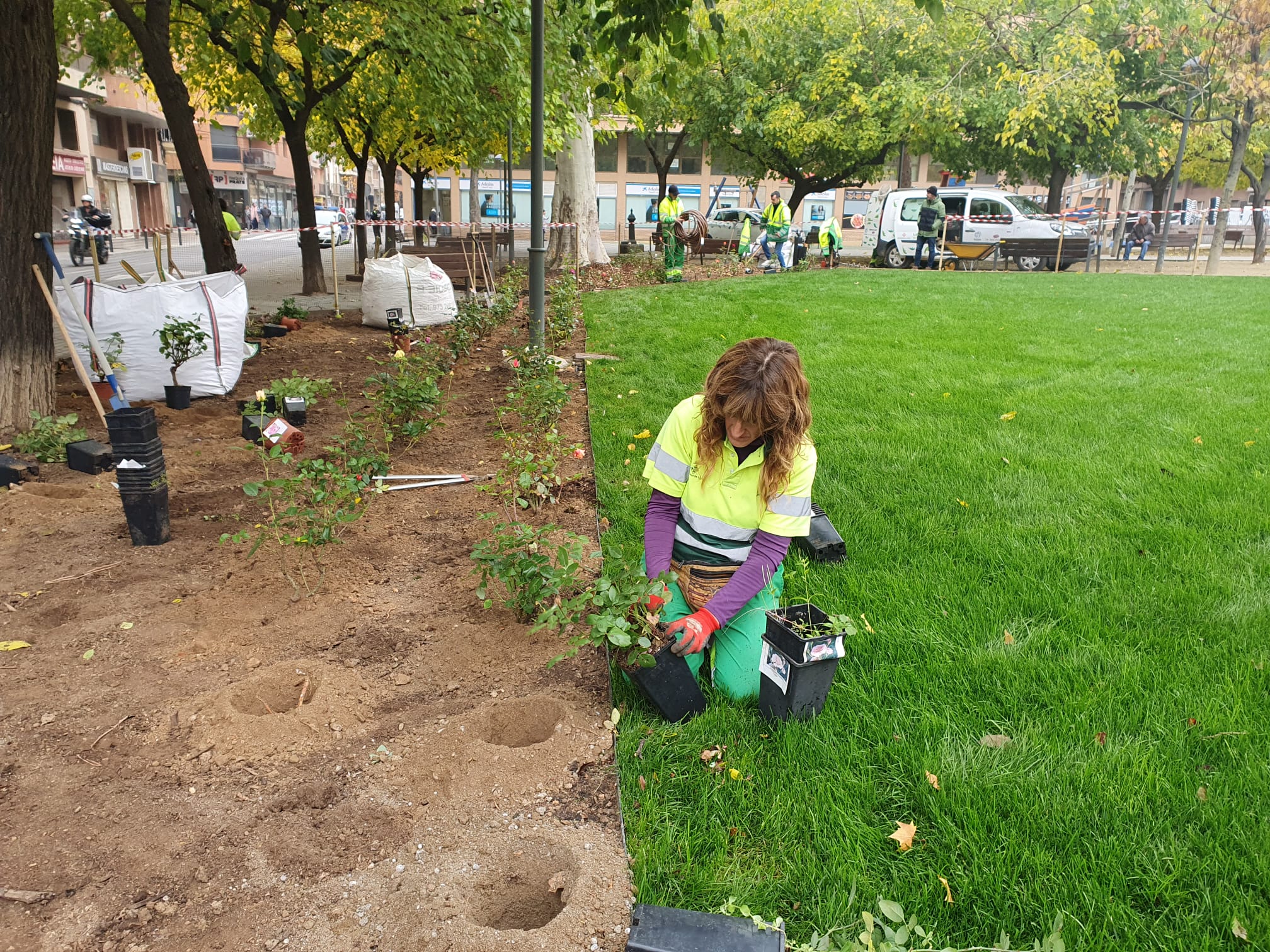 Ahora se está renovando el ajardinamiento en la plaza Pau Casals, con la plantación de un parterre con césped y un centenar de rosales