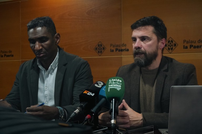 El teniente de alcalde Carlos Enjuanes y el concejal de Deportes, Jackson Quiñónez, informaron de cómo fue la comisión extraordinaria celebrada hoy, donde el único punto del orden del día era la propuesta de convenio entre la Paeria el Lleida CF para el uso especial del Camp d'Esports.