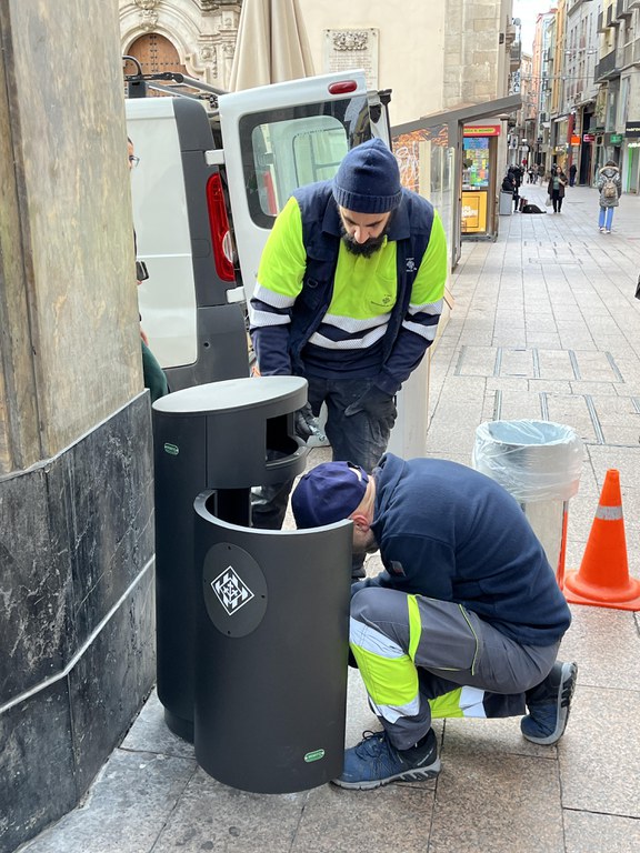 La Brigada Municipal de Obras ha iniciado hoy la sustitución de las 61 papeleras que hay a lo largo de las calles del Eix y que se completará en las próximas semanas. Concretamente, están situadas en las calles de Sant Joan, del Carme, de Cardenal Remolins, de Magdalena, de Pi i Margall, Major, de Sant Antoni y del Alcalde Costa, además de las plazas de Sant Joan, de la Sal y de la Paeria. También está previsto instalar alguna más de refuerzo en determinados puntos.