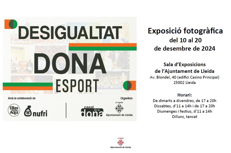 En este marco, del 10 al 20 de diciembre, se podrá ver la exposición fotográfica Desigualdad, mujer y deporte en la sala de exposiciones del Ayuntamiento de Lleida (Av. Blondel, 40, edificio antiguo Casino). La muestra consta de 12 fotografías en formato cartón pluma que invitan a reflexionar sobre los desafíos históricos, las luchas actuales y las oportunidades de construir un futuro más equitativo. En concreto, las fotografías evidencian las desigualdades en el deporte en lo que se refiere a la participación femenina, la brecha salarial y económica, la representación en los medios de comunicación, la estigmatización y estereotipos, las desigualdades en patrocinios y marketing, así como en liderazgo y puestos de responsabilidad y toma de decisiones, el embarazo y la maternidad, las desigualdades en premios de competiciones, la violencia y el abuso, y el público y asistencia.