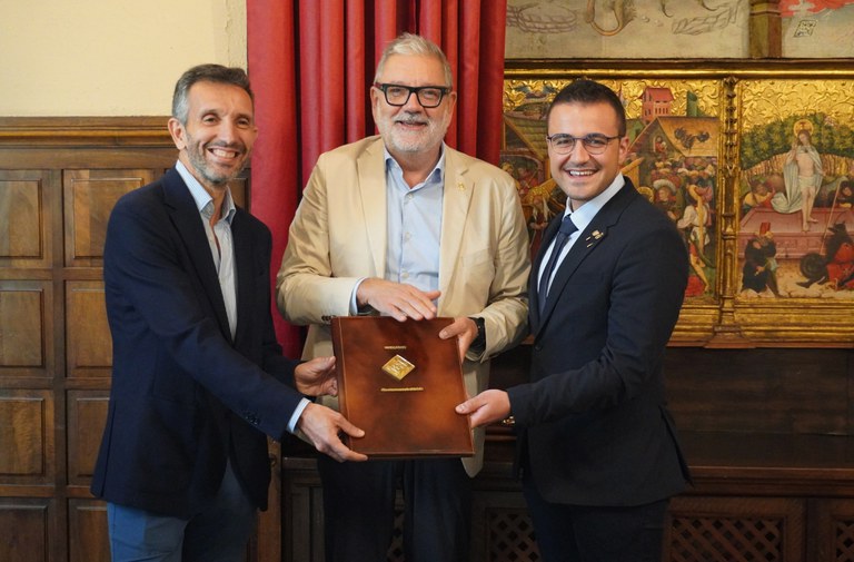El alcalde de Lleida, Fèlix Larrosa, el presidente de la Entidad Municipal Descentralizada (EMD) de Raimat, Iván Fernández, y el consejero delegado de Raventós-Codorníu, Sergio Fuster, han firmado hoy la escritura de cesión gratuita por parte de la empresa de dos fincas en esa población.