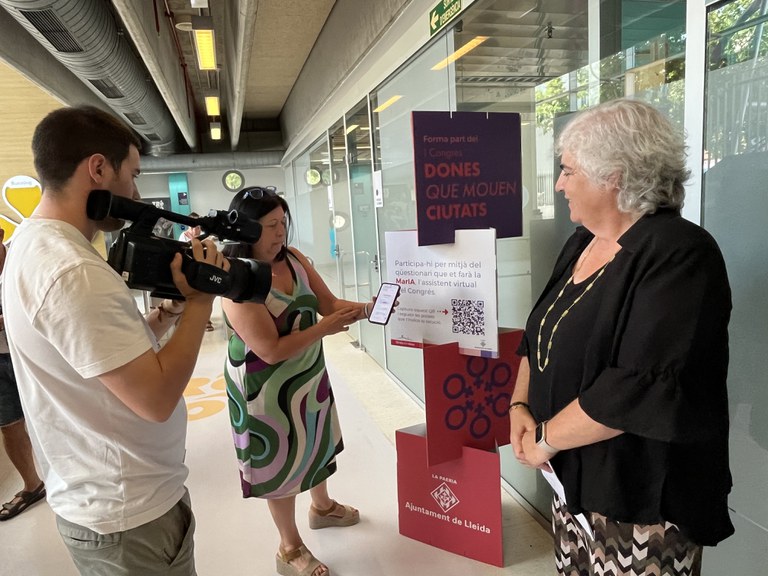 El Ayuntamiento de Lleida ha instalado 28 tótems con un código QR en diferentes equipamientos de la ciudad como centros cívicos, deportivos, locales sociales y Centros de Atención Primaria (CAP), para facilitar a la ciudadanía, especialmente a las mujeres, tomar parte en el proceso participativo del I Congrés DONES QUE MOUEN CIUTATS . La teniente de alcalde y responsable de la Concejalía de Políticas Feministas, Carme Valls, ha presentado hoy la distribución de puntos fijos y móviles en el Trèvol Lleida, acompañada por la directora del equipamiento deportivo, Maria Campos.