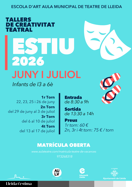 El Aula Municipal de Teatro de Lleida abre el plazo de inscripción a los Talleres de Creatividad Teatral de Verano 2026, una propuesta educativa y artística dirigida a niños de 3 a 12 años, desde I3 hasta 6º del curso 2025/26.