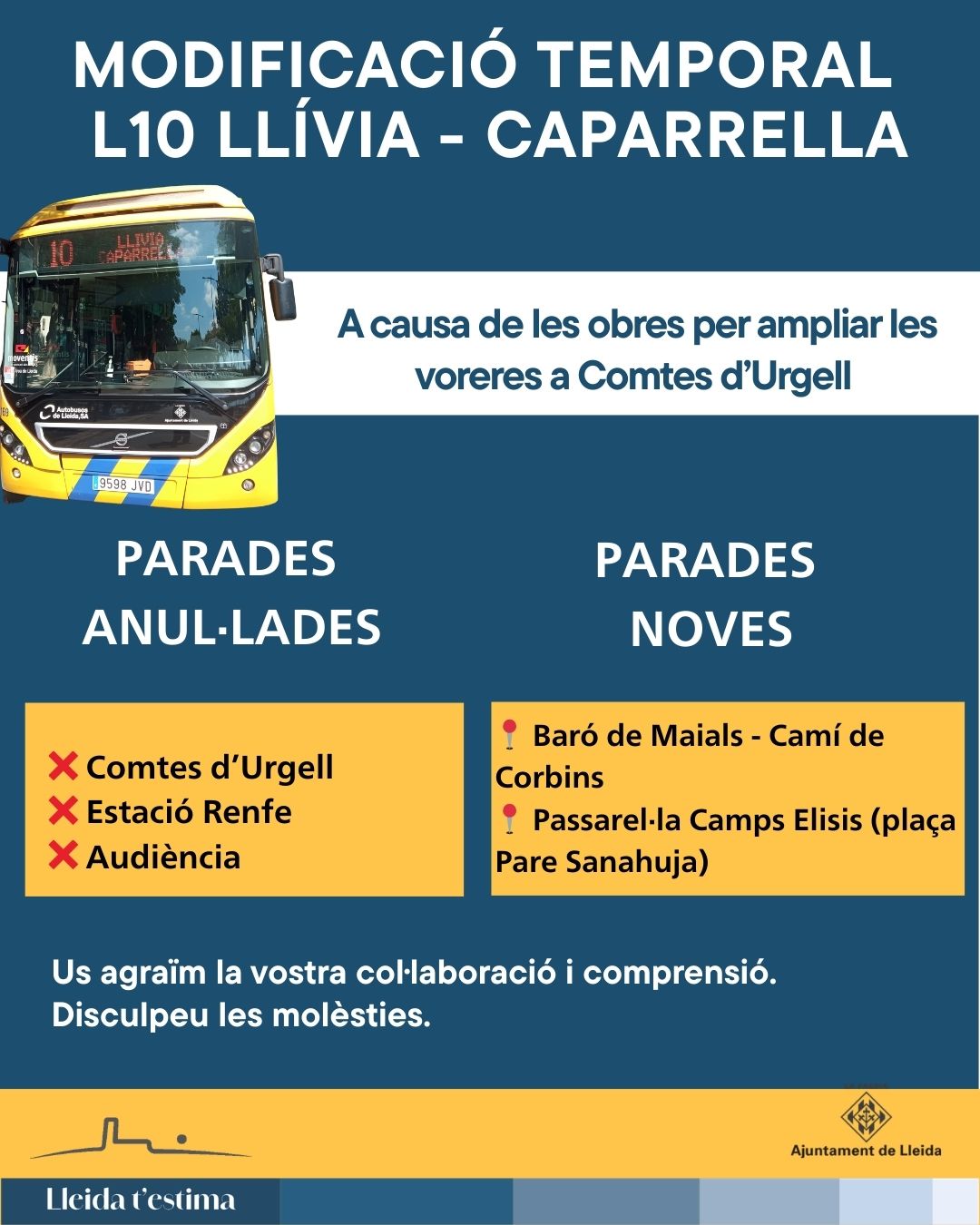 A partir de este jueves, el Ayuntamiento de Lleida adapta temporalmente el recorrido de la línea L10 de transporte urbano en sentido Caparrella con motivo de las obras de ampliación de aceras en la calle Comtes d'Urgell, actuación vinculada al proyecto de mejora del espacio público y prolongación del carril bici hasta Prat de la Riba.