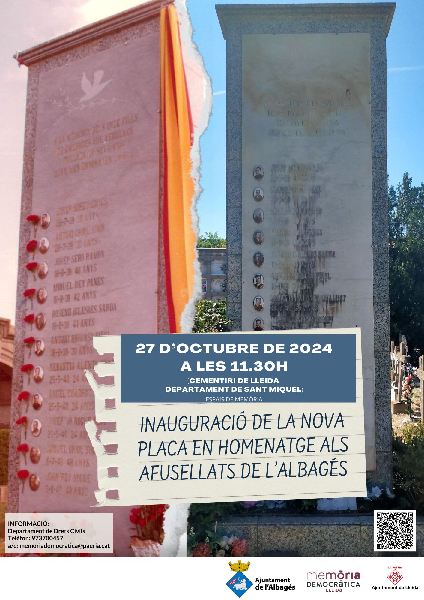 El Ayuntamiento de Lleida ha renovado la placa del monumento dedicado a los fusilados de la población del Albagés que se encuentran enterrados en el Cementerio de Lleida y este domingo día 27 procederá a su inauguración con un acto abierto a la ciudadanía. La placa original del monumento se había ido deteriorando en el transcurso del tiempo y el área de Memoria Democrática de la Paeria ha llevado a cabo las gestiones para sustituir a este elemento arquitectónico con el visto bueno de los familiares.