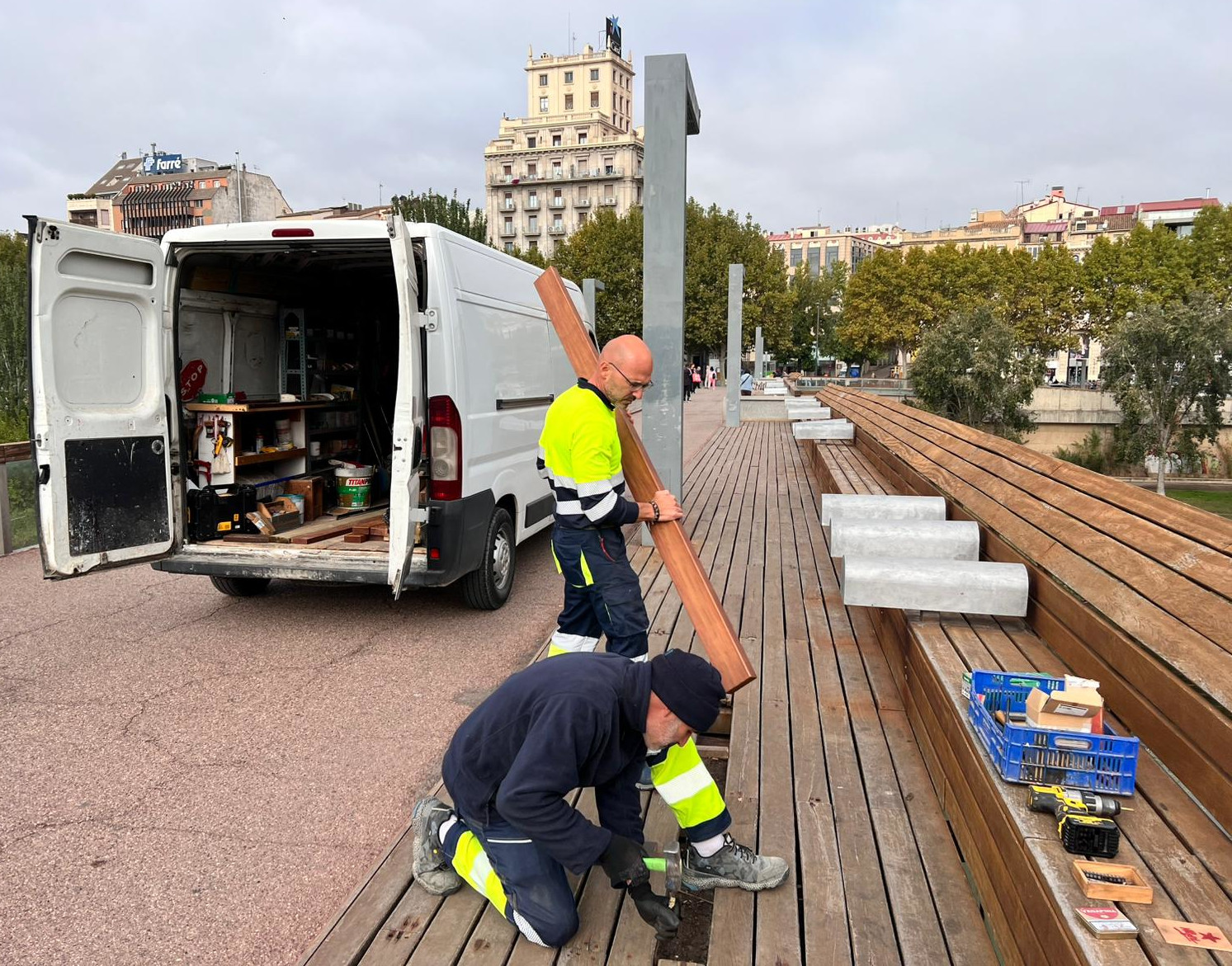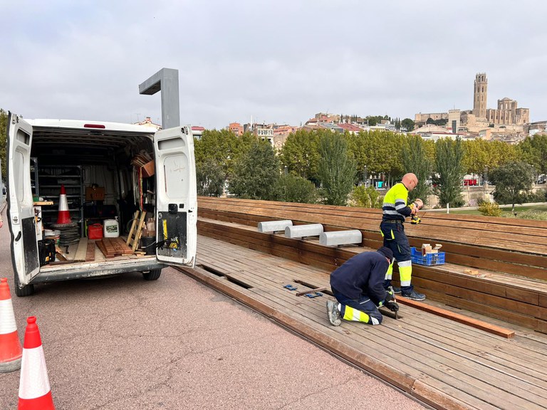 Operarios de la brigada de obras del Ayuntamiento de Lleida han reparado esta mañana desperfectos en las quinielas de madera del pavimento de la pasarela del Liceu Escolar, que habían sido arrancadas por un acto vandálico, lo que podía comportar riesgo de caídas.