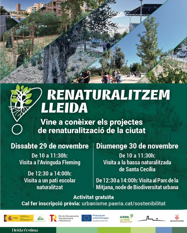 El Ayuntamiento de Lleida ha programado de nuevo un fin de semana dedicado a conocer los proyectos URBAN-NAT Lleida de renaturalización, adaptación al cambio climático y mejora de la biodiversidad de Lleida. El sábado 29 y el domingo 30 de noviembre, el personal técnico encargado del proyecto de la concejalía de sostenibilidad, mostrará las diferentes actuaciones que se están llevando a cabo desde finales de 2022 y que finalizan, en lo que se refiere a la obra pública, a finales de año.