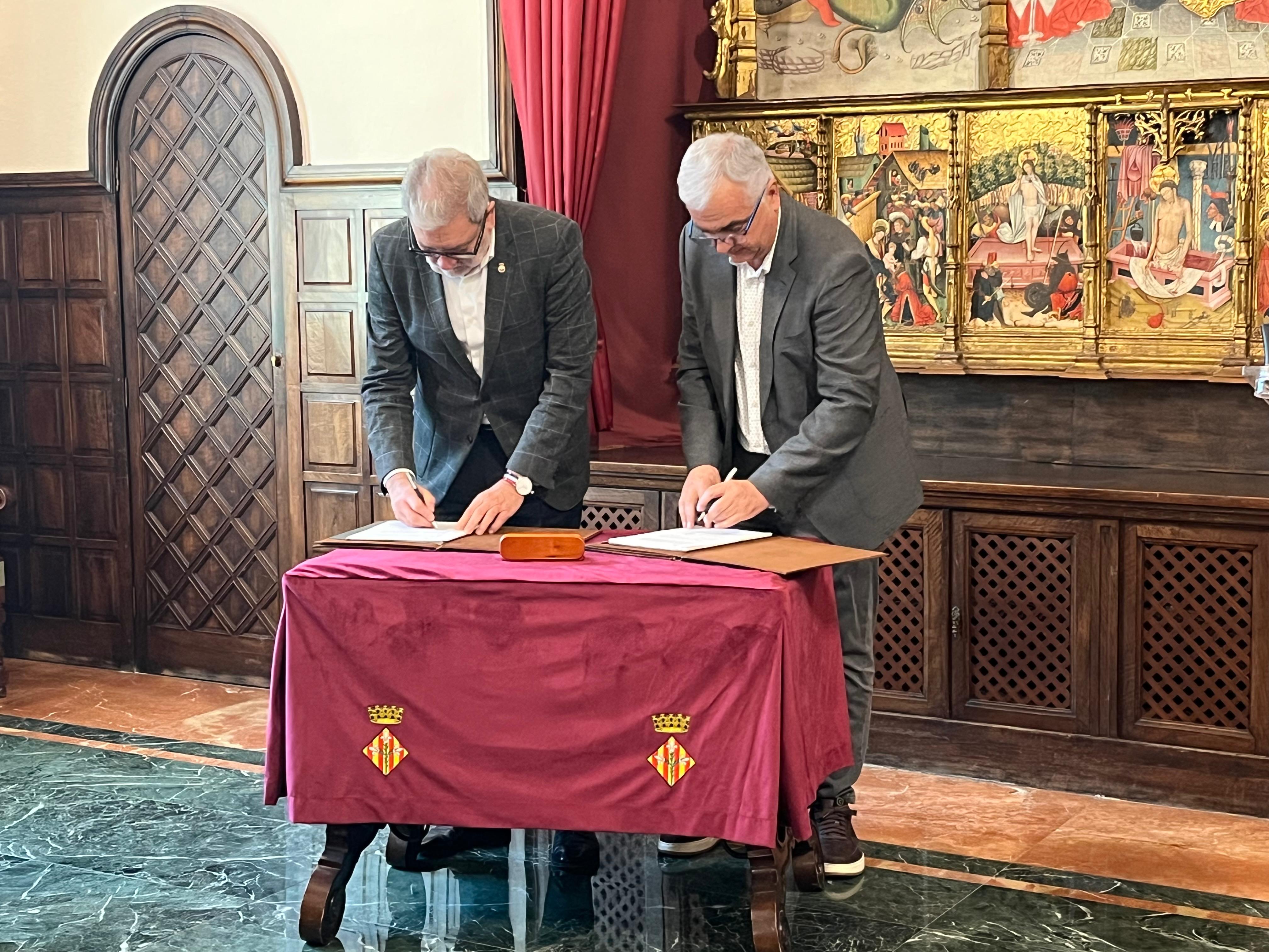 El alcalde, Fèlix Larrosa, y el presidente del Força Lleida Club Esportiu, Albert Aliaga, han firmado hoy un convenio de autorización de uso especial del pabellón municipal Barris Nord, que permitirá al club desarrollar su actividad deportiva durante las próximas cuatro temporadas.