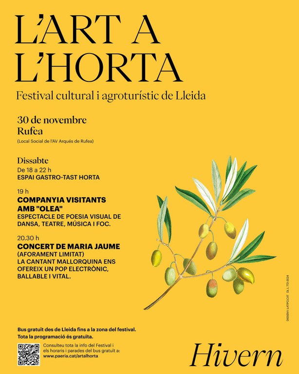 Las artes escénicas, el paisaje de l'Horta y los productos de Km0 volverán a ser los protagonistas del festival Art en l'Horta, que cerrará la primera edición con el ciclo de invierno en la Partida de Rufea , el próximo sábado 30 de noviembre. Lo hará con dos propuestas gratuitas: "Olea", de la compañía Visitants, y la música de la mallorquina Maria Jaume, en una experiencia innovadora que tendrá lugar dentro de un iglú de viento, con plazas limitadas.