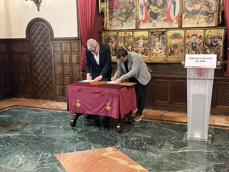 El alcalde, Fèlix Larrosa, y el presidente del SE AEM Lleida, Paco Garcia, han firmado hoy un convenio de autorización de uso especial del Campo Municipal de Fútbol de Recasens y el Camp Anexo para que el club pueda desarrollar entrenamientos, competiciones oficiales y otras actividades vinculadas al fútbol base y senior.