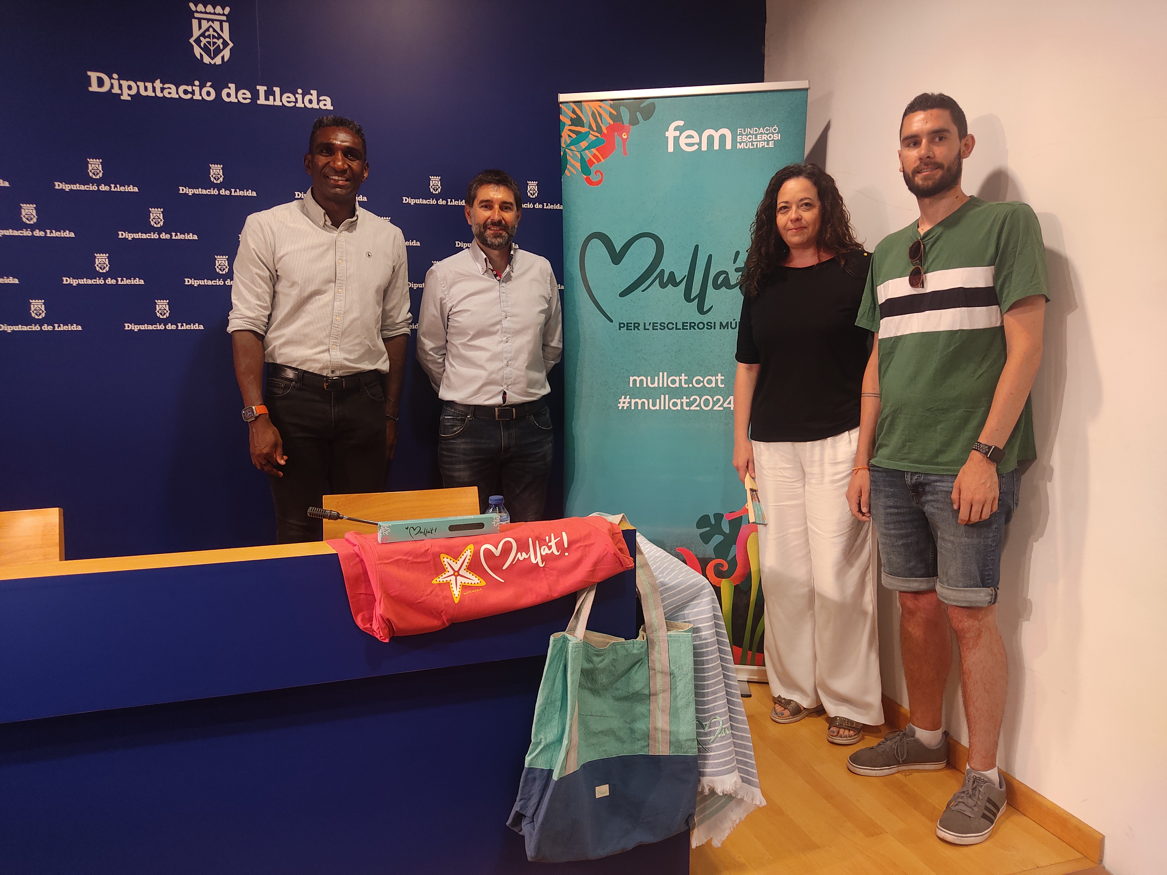 El acto central de la campaña ‘Mulla’t per l’Esclerosi Múltiple’, que celebra su 31ª edición, vuelve a celebrarse este verano en Lleida. Será el domingo, 14 de julio, a las 12 de la mañana, en las piscinas municipales de Balàfia. Además, todas las piscinas municipales de la ciudad destinarán la recaudación de ese día a la iniciativa, que tiene por objetivo conseguir fondos y sensibilizar a la sociedad sobre esta enfermedad neurológica incurable que afecta a más de 9.000 personas en Catalunya. En el acto de presentación, el concejal de Deportes, Jackson Quiñónez, hizo un llamamiento a la ciudadanía para que se sumen al 'Mulla't' yendo a las piscinas, haciendo donativos o comprando merchandising. En el acto, también han participado Mònica Nieves, directora del Centro Neurorrehabilitador de Lleida, y Òscar Martínez, diputado de Salud Pública de la Diputació de Lleida.