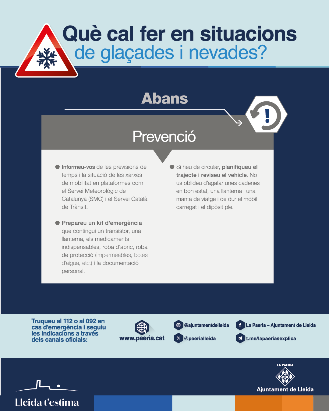 El Ayuntamiento de Lleida tiene listo el dispositivo especial de Protección Civil que se activa en caso de temperaturas más bajas de lo habitual y en caso de riesgo de nevadas. Protección Civil de la Generalidad de Cataluña ha activado el Plan especial de emergencias por nevadas en Cataluña (NEUCAT) por la previsión de nevadas en cotas bajas durante los días 4 y 5 de enero. En el caso de las comarcas de Ponent, las previsiones indican que las nevadas serán débiles y dispersas.