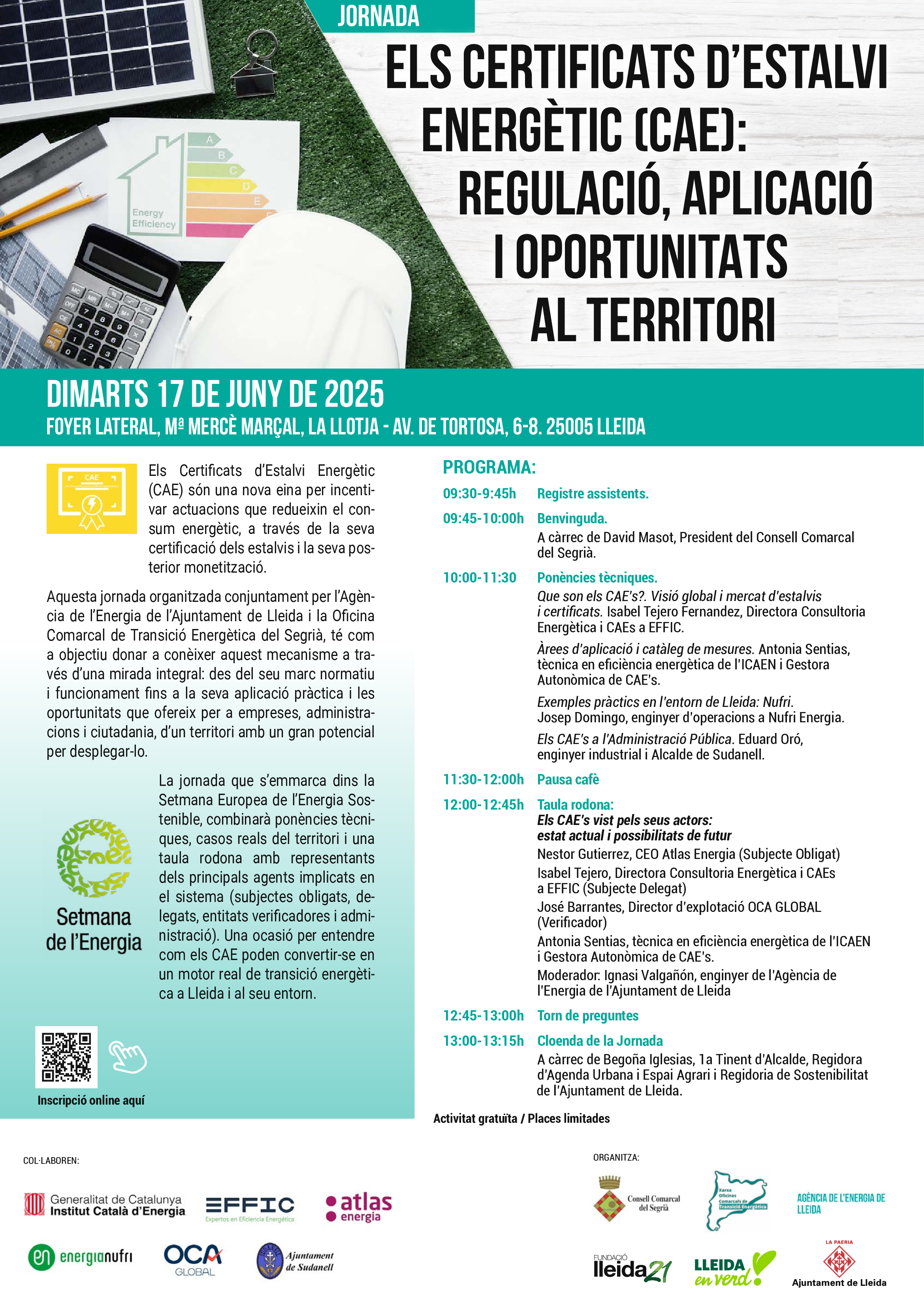 El próximo martes 17 de junio, la Llotja acogerá la jornada “Los Certificados de Ahorro Energético (CAE): regulación, aplicación y oportunidades en el territorio”, organizada por la Agencia de la Energía del Ayuntamiento de Lleida y la Oficina Comarcal de Transición Energética del Segrià, en el marco de la Set'.