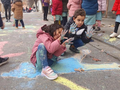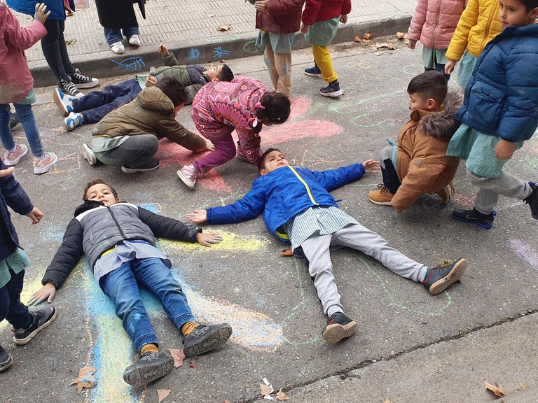 Los niños han elaborado una instalación artística para reivindicar a las víctimas infantiles que se han sufrido en diferentes países donde hay conflictos latentes. La acción reivindicativa ha tenido lugar en dos plazas del barrio de la Bordeta donde, de forma simultánea con los diferentes centros escolares de la zona -Escuela Parque del Agua, Enric Farreny, la Ludoteca Municipal y CEE la Esperanza, Joan Maragall , El Carme y el IES Maria Rubies-, los niños han dibujado en el suelo su propia silueta queriendo expresar que las personas víctimas de conflictos bélicos son personas como ellos y ellas En el transcurso del acto también se ha leído el manifiesto de la entidad Aturem les Guerras.