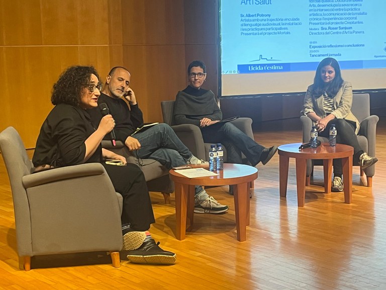 La mesa, moderada por la directora del Centro de Arte La Panera, Roser Sanjuan , ha contado con Albert Potrony , artista con una trayectoria vinculada al lenguaje audiovisual, la instalación y las prácticas participativas que ha presentado el proyecto Mortales ; la artista, investigadora y paciente de fibrosis quística Elisa González , impulsora del proyecto Crepitantes , donde confluyen la práctica artística, la comunicación de la enfermedad crónica y la experiencia corporal; y la licenciada en historia e historia del arte y especializada en mediación del arte contemporáneo Txell Bosch , que ha dado a conocer el proyecto AlimentAR-T , en el que participa el Morera, Museo de Arte Moderno y Contemporáneo y la Atención Primaria de Salud de Lleida con el objetivo de potenciar el arte como vía de mejora de la salud de las personas.