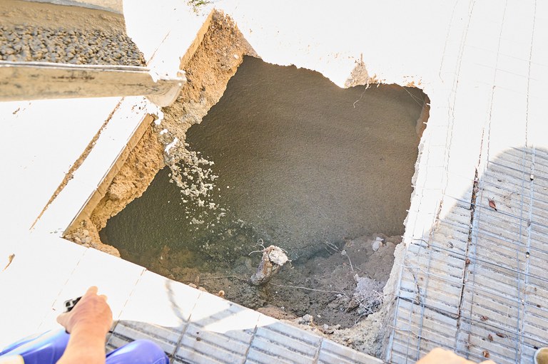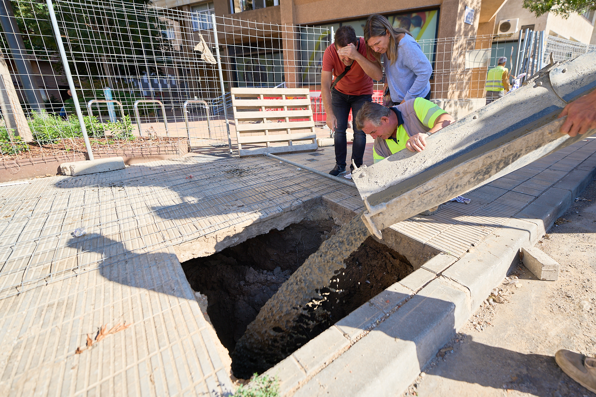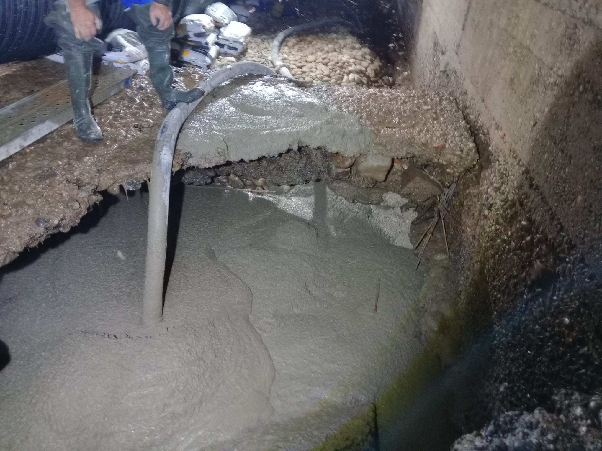Llenado de hormigón el boquete detectado en la canalización del río Noguerola bajo la avenida del Segre