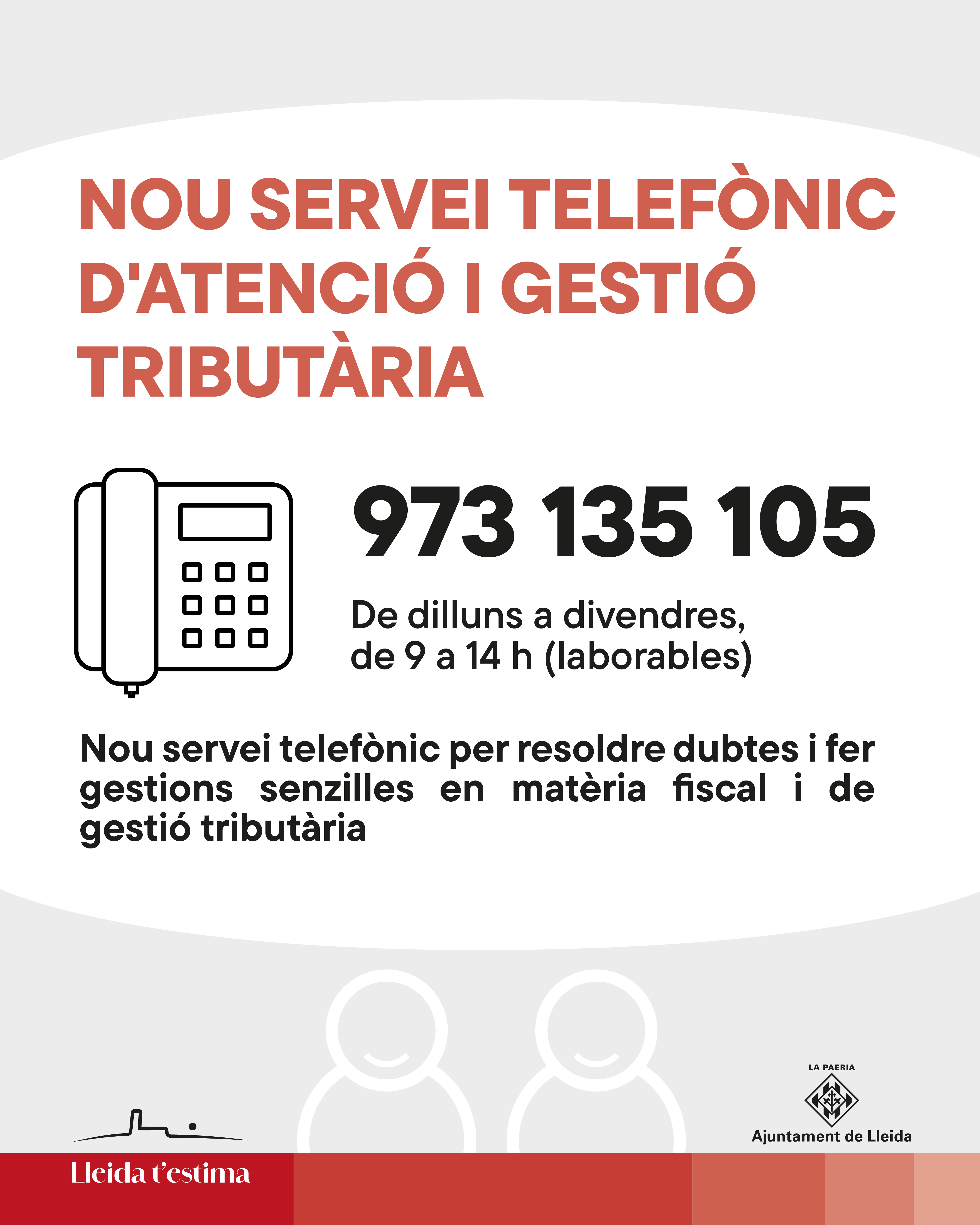 El servicio telefónico de atención y gestión tributaria funciona a través del teléfono 973135105, de lunes a viernes laborables en horario de 9 a 14 h. Las personas que llaman cuentan con la ayuda de una persona que las atiende y despeja las dudas sobre sus expedientes o notificaciones. También pueden gestionar con su llamada trámites como domiciliaciones, realizar cambios de datos fiscales, obtener duplicados de documentos de pago o activar un plan personalizado de pago.