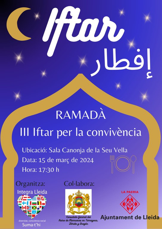 Para romper el ayuno se contará con la participación de diferentes colectivos de la ciudad que preparar platos típicos de la gastronomía Marroquí, Guinea Conakry y Senegal. Además, se podrá escuchar la conferencia "Ramadá y convivencia: Un diálogo de valores" a cargo de Chaimaa Arjam El Hamdioui, empresaria Leridana que hablará del empoderamiento de la mujer en la sociedad musulmana, y Hajar Rabii, activista por la defensa derechos de las mujeres.