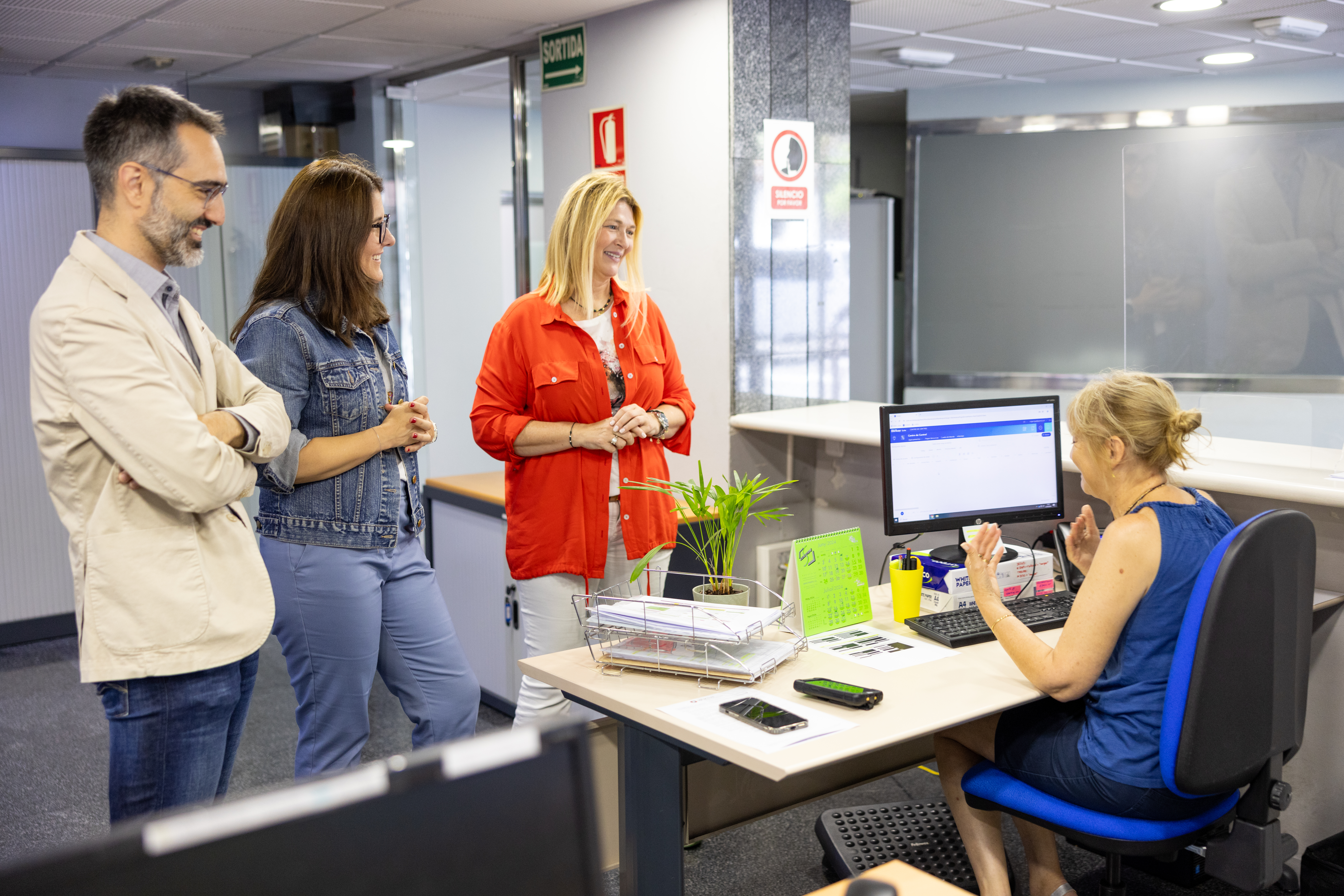 En la oficina de la plaza Blas Infante, las tenientes han saludado a todo el personal de la oficina, pasando por las administrativas y responsables de atención al público, hasta los y las vigilantes, los operarios de mantenimiento y el informático. Iglesias y Morón también han dado la bienvenida a dos nuevas vigilantes de la oficina, recientemente incorporadas, y han podido probar con el gerente del EMAU la máquina de parquímetro que tienen instalada de muestra para poder realizar pruebas y mejorar su funcionalidad.
