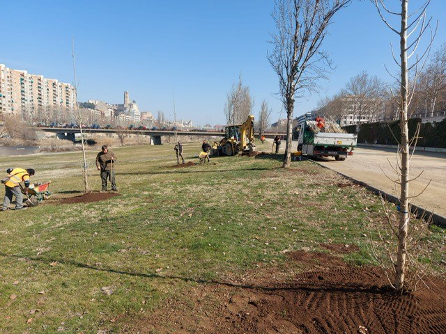 Los trabajadores y trabajadoras del Centro especial de Trabajo Salvador Seguí, del Institut Municipal d'Ocupació (IMO), están plantando 60 chopos en el parque del Segre. La actuación de mejora ha consistido en la repoblación de ejemplares y el alargamiento de la línea de arbolado existente hasta ahora. Se ha plantado árboles entre la pasarela del Liceo Escolar y el puente de la Universidad, donde no había hasta ahora y se ha iniciado un proceso de regeneración de la zona con activadores de defensas y control de plagas de forma sostenible.
