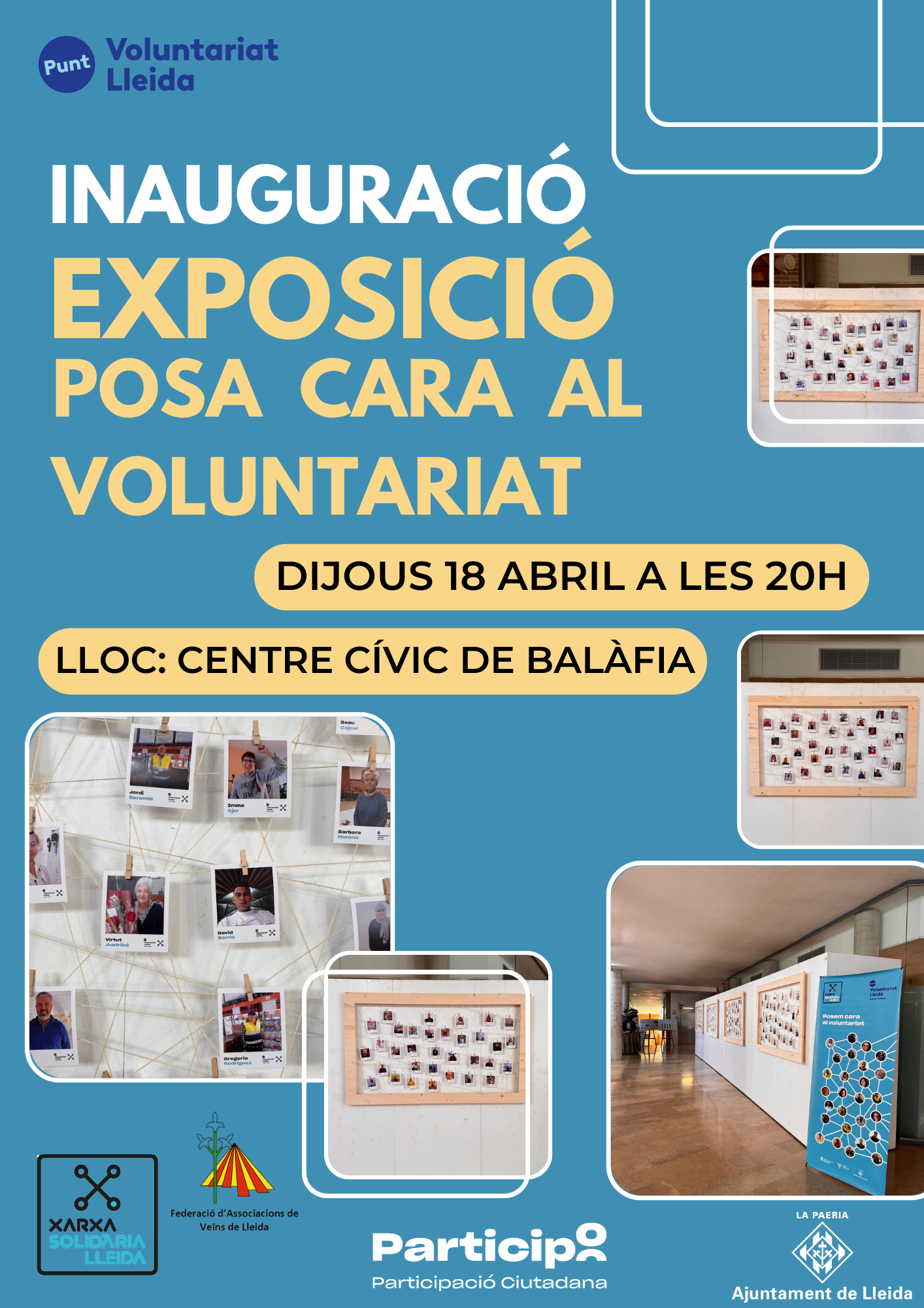 La exposición 'Posa Cara al Voluntariado' es de cariz itinerante. Se podrá visitar durante el mes de abril en el centro cívico de Balafia y después irá rodando en el resto de centros cívicos de la ciudad de Lleida.