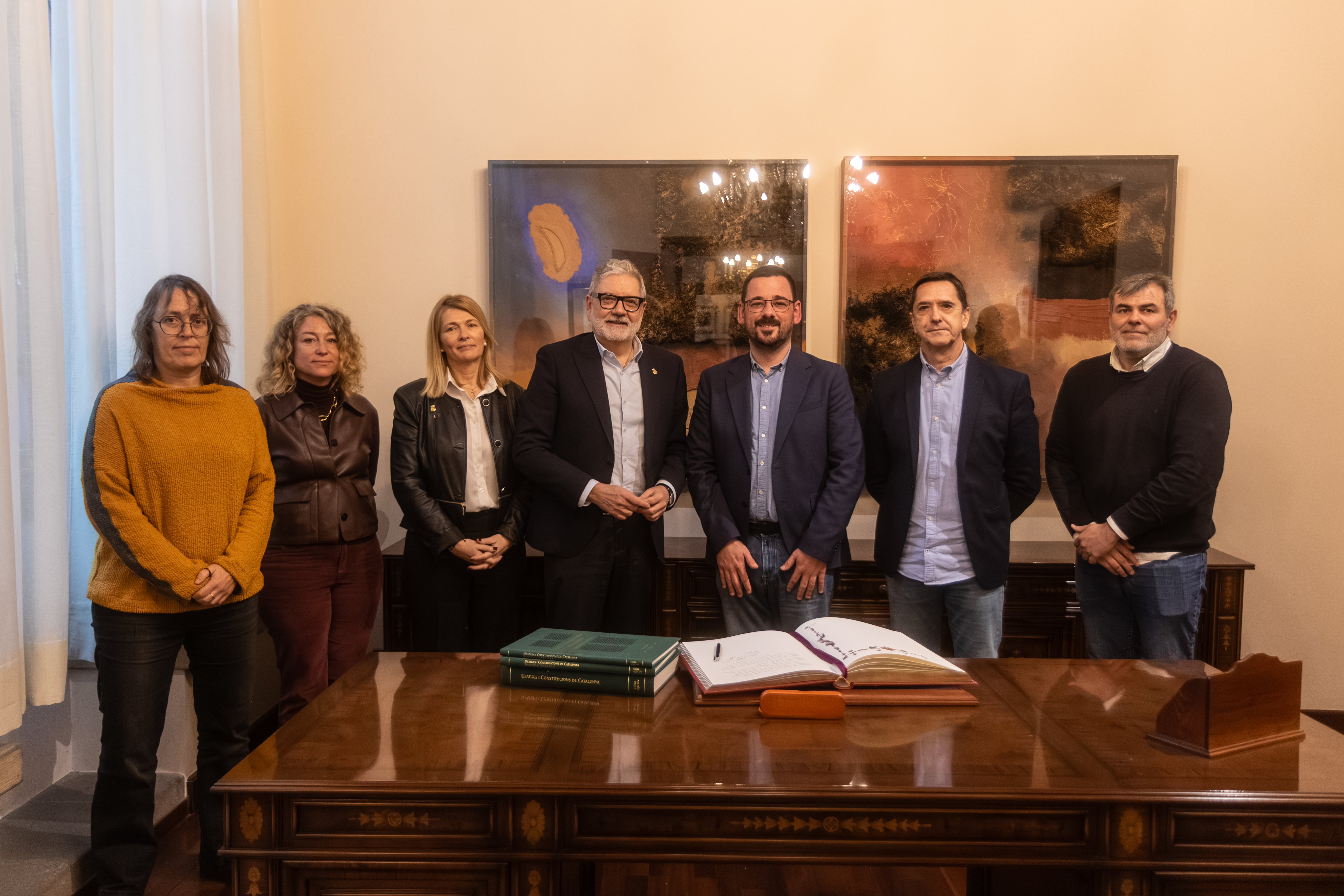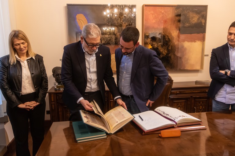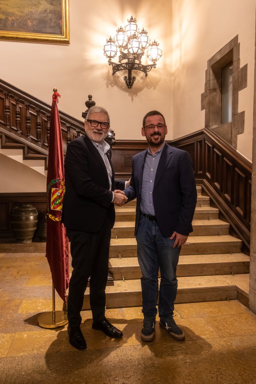 El alcalde de Lleida, Fèlix Larrosa, ha recibido a Lluc Salellas que ha firmado en el Libro de Oro de la Paeria y ha visitado el Salón de Sesiones y el Retablo de la Virgen de los Paers