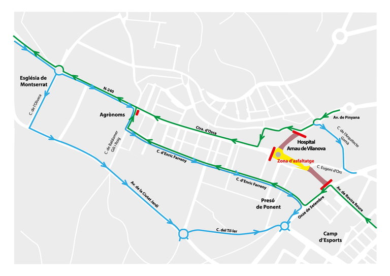 Se habilitarán recorridos alternativos por los vehículos y se facilitará el acceso de las ambulancias al área de Urgencias del hospital Arnau de Vilanova ya los vados de los vecinos de la zona. La calle Eugeni d'Ors será de uso exclusivo por urgencias.