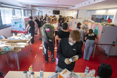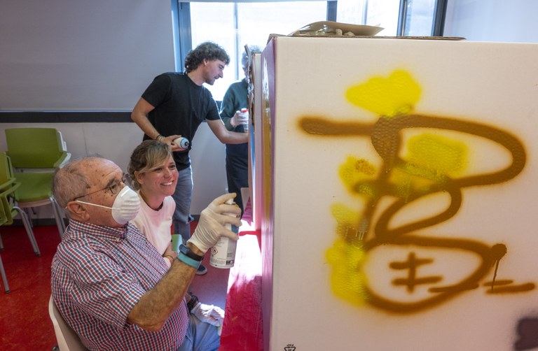 El GAMMA, el Festival de Arte Urbano de Lleida que se celebra en Balàfia, ha comenzado hoy las actividades participativas. Durante la mañana, varios usuarios y usuarias de la residencia Balàfia II han participado en el taller "AVI-FITTI" AUTORETRATOS CON STENCILS. Los padrinos y madrinas han pintado caras, con sprays de colores y con la ayuda de plantillas, en cajas de cartón. Las concejalas de Cultura, Pilar Bosch, y de Balàfia, Carme Valls, han visitado el taller acompañadas por la directora del festival, la artista urbana Lily Brick.