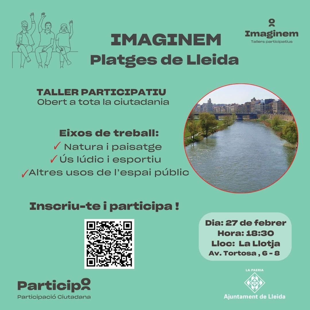 El proceso participativo Imaginem Platges de Lleida ha organizado un taller abierto a todo el mundo para detectar y debatir las necesidades y las demandas de la ciudadanía y plantear posibles usos de acuerdo al espacio. La actividad pretende incentivar a los vecinos y vecinas para que participen en la definición de este espacio y se tome conciencia de las diferentes perspectivas a valorar, como la diversidad, la sostenibilidad, la funcionalidad, etc. El taller participativo tendrá lugar el jueves 27 de febrero, a las 18.30 h, en la Llotja y el trámite para participar estará activo hasta el martes 25.