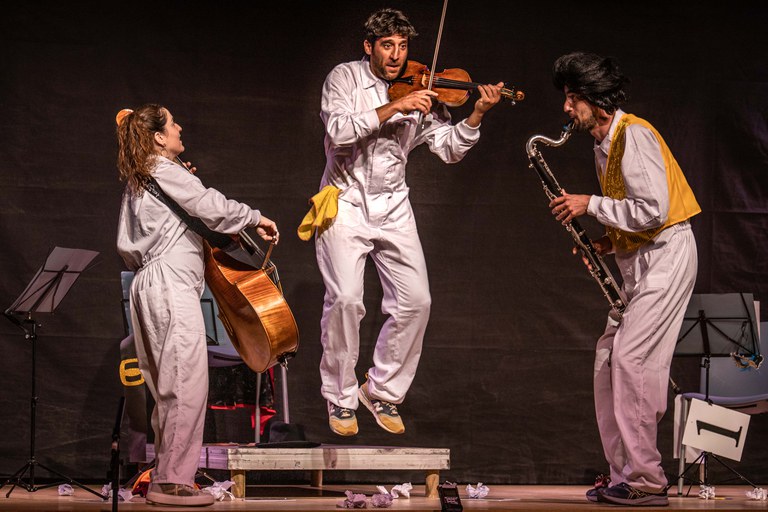 Un espectáculo familiar que nos transporta a través de la historia de la música. Tres trabajadores del teatro (jefe de mantenimiento, trabajador de la limpieza y jefe de sala) se encuentran un clarinete, un violonchelo y un violín. A través de elementos de ropa de distintas épocas viajarán en diferentes años visualizados en el escenario y que les llevará a tocar grandes temas de la historia de la música. Un eje cronológico inverso que comienza en la actualidad enganchando al público desde el 1r tema. Pasa por la música pop, el rock, el jazz, la clásica contemporánea, el romanticismo, el clasicismo, el barroco y la música trovadoresca.