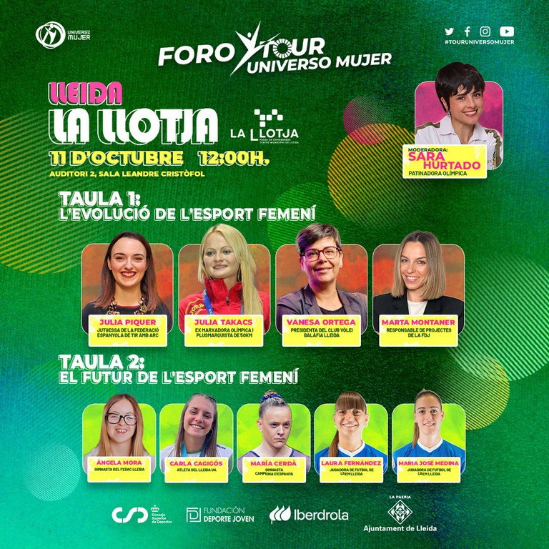 El Tour Universo Mujer (TUM), la gran fiesta del deporte que llega a Lleida este fin de semana, calienta motores mañana viernes con un foro sobre la evolución del deporte femenino en estos últimos años y, concretamente, en la ciudad de Lérida. El coloquio se hará en la Llotja, en la sala Leandre Cristòfol, a las 12 h, con entrada gratuita, y forma parte del programa de actividades que el TUM ha organizado con la Paeria y que tendrá lugar el sábado 12 y el domingo 13, en la plaza de Sant Joan.