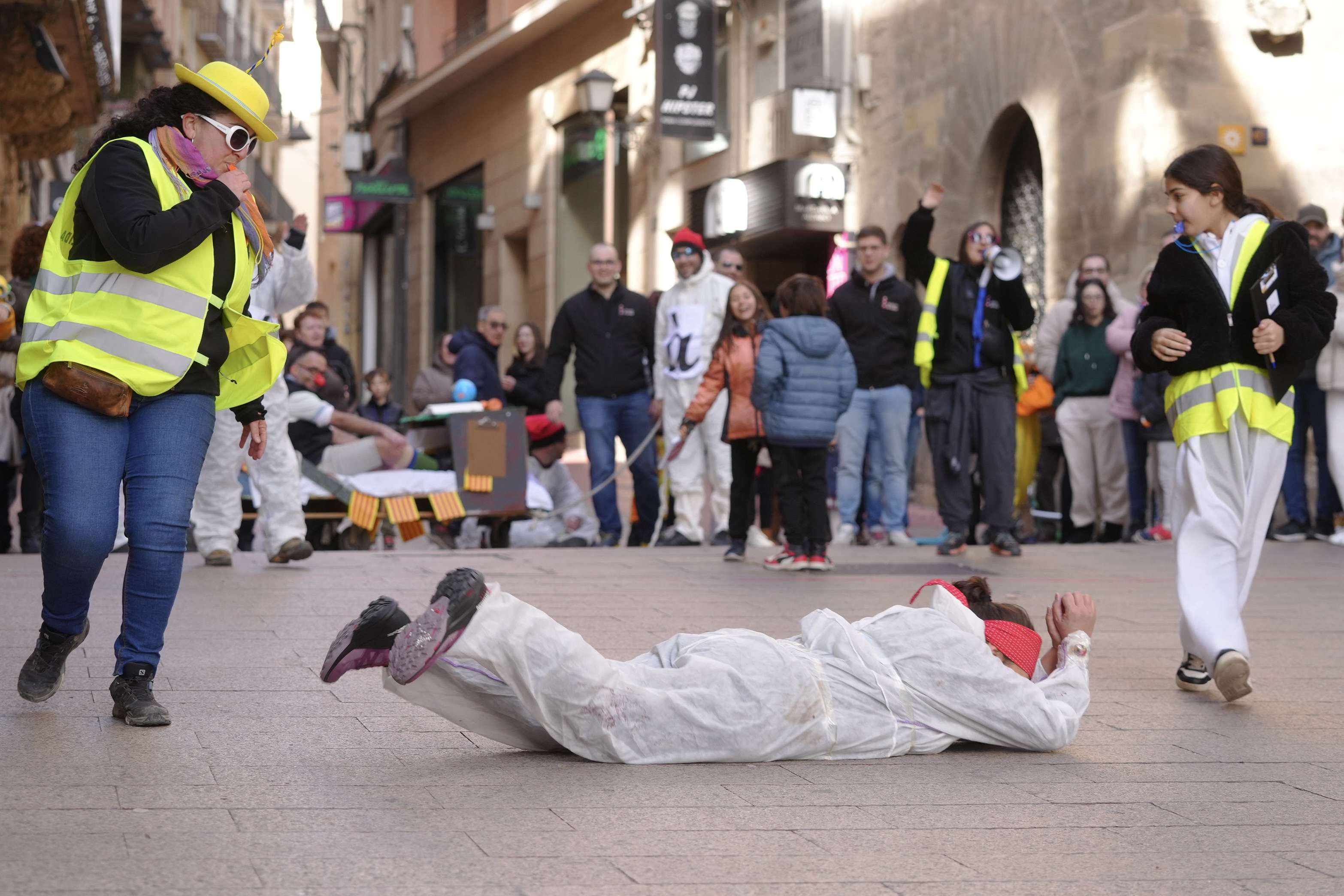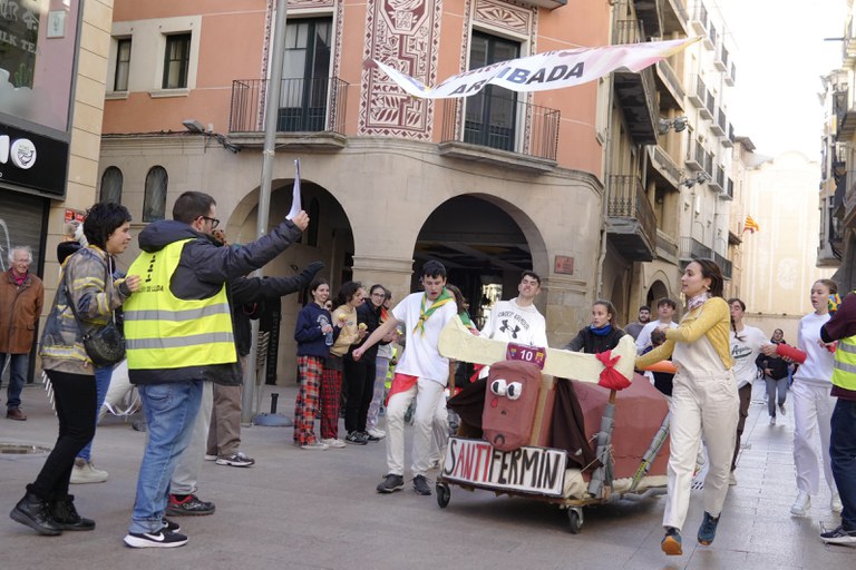 La carrera con pingüinos, maestros de catalán, bomberos, artistas de circo, pitufos, corredores de los encierros , barbias o niños y niñas en pijama, entre otros, ha hecho un sonado descenso desde la plaza de Sant Josep, frente a la iglesia de Sant Llorenç, hasta la plaza de Sant Joan, en el centro de la ciudad, habiendo cruzado de bajada buena parte del Centro Histórico y superando diferentes pruebas que marca el recorrido.