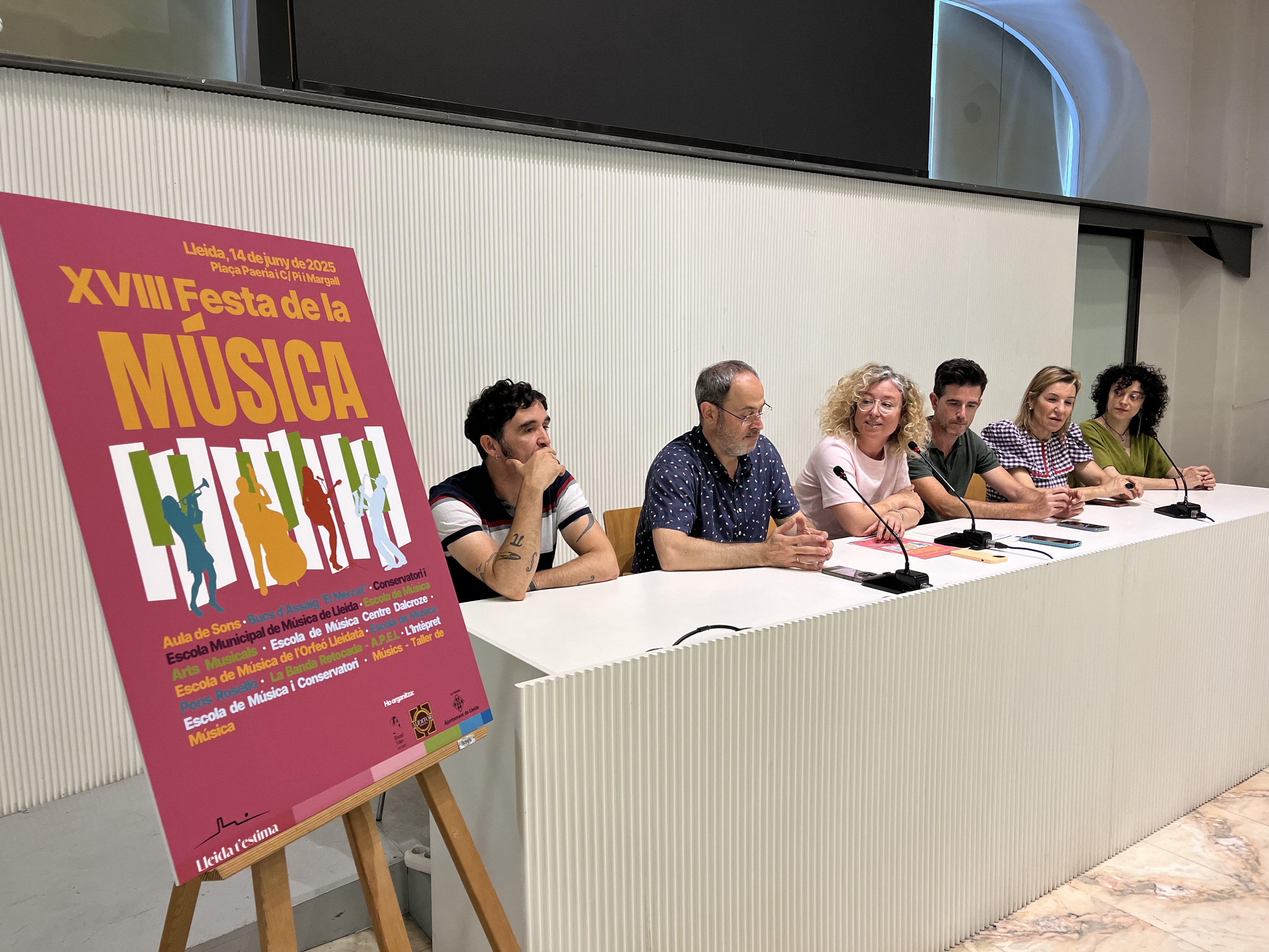 La música será la protagonista este sábado, 14 de junio, durante todo el día en el centro de Lleida, donde el público podrá ver y escuchar en directo a más de una veintena de actuaciones a cargo de una decena de escuelas de música y de formaciones locales de diversos géneros musicales. La concejala de Cultura, Pilar Bosch, ha presentado hoy la programación, cuyo objetivo es popularizar la práctica musical y acercarla a toda la ciudadanía. También han participado Alfons Pérez, de Intèrpret Escola de Música i Conservatori; Jordi Rexach, de la Escola de Música de l’Orfeó Lleidatà; Maylos Pons, de la Escola de Música Pons Roselló; Màxim Solanes, de la Escola de Música Centre Dalcroze; i Patrícia Giménez, de La Banda Retocada-A.P.E.L.