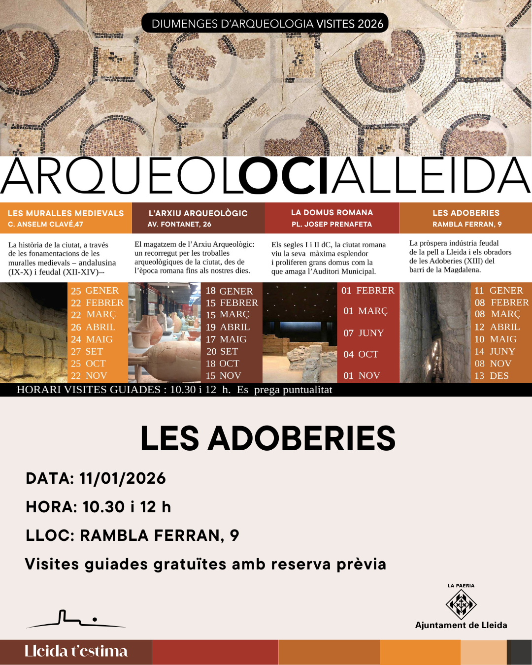 Mañana domingo, se reanuda el calendario de los Domingos de Arqueología 2026, con dos visitas guiadas gratuitas a las antiguas curtidurías medievales de la rambla de Ferran número 9, un espacio con un alto valor histórico y patrimonial. Datan del siglo XIII y están formadas por dos obradores que contienen todavía la canalización que se utilizaba en la Edad Media, así como los elementos necesarios para el abono de las pieles para su aprovechamiento. Son de las más antiguas de España y las que mejor se han conservado.